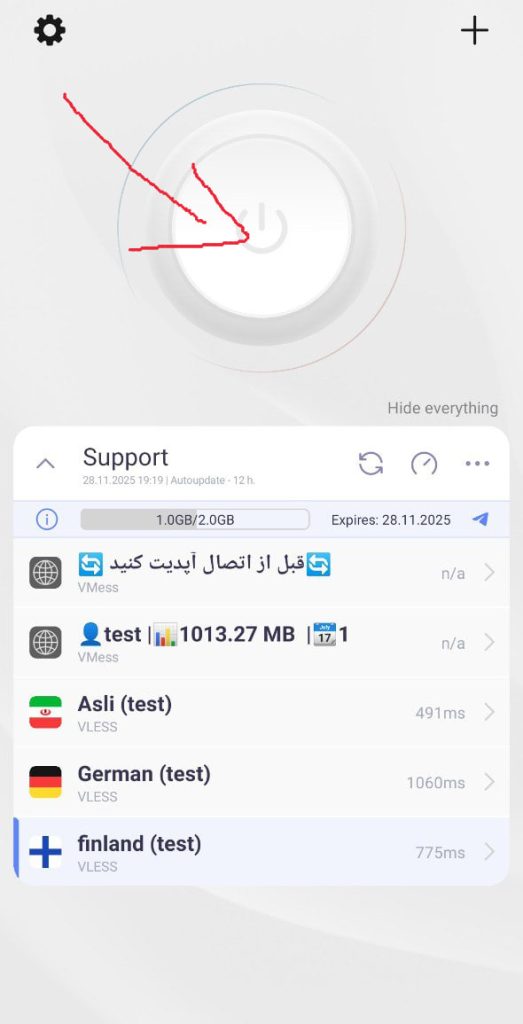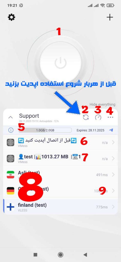 6- یک پیام از سمت ماست که یادتون نره همیشه قبل اتصال گزینه اپدیت رو یکبار بزنید تا کانفیگ ها بروز شوند